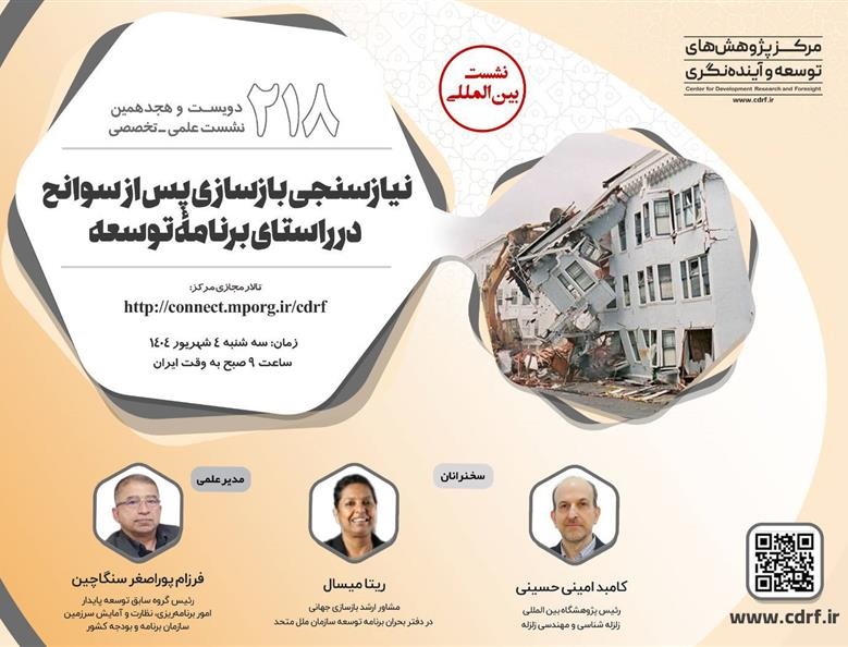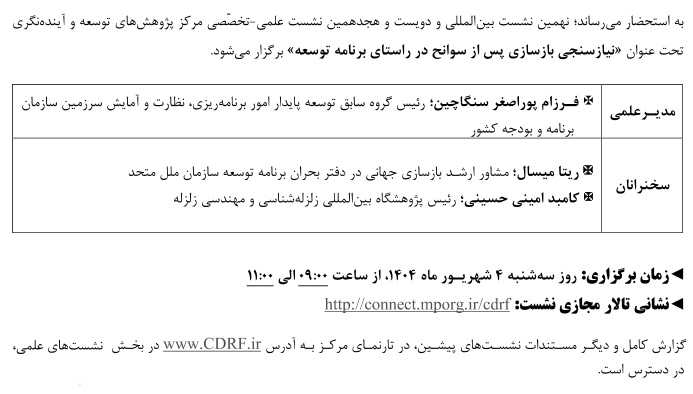 نشست علمی نیاز سنجی بازسازی سوانح در راستای برنامه توسعه ۰۳ شهریور ۱۴۰۴ | ۱۲:۳۷ کد : ۵۴۰۰۰ اطلاعیه ارسال به دیگران نام شما ایمیل شما ایمیل دریافتکننده ارسال انصراف تعداد بازدید:۱۶۴۴ نشست علمی نیاز سنجی بازسازی سوانح در راستای برنامه توسعه، توسط مرکز پژوهش های توسعه و آینده نگری برگزار می گردد.