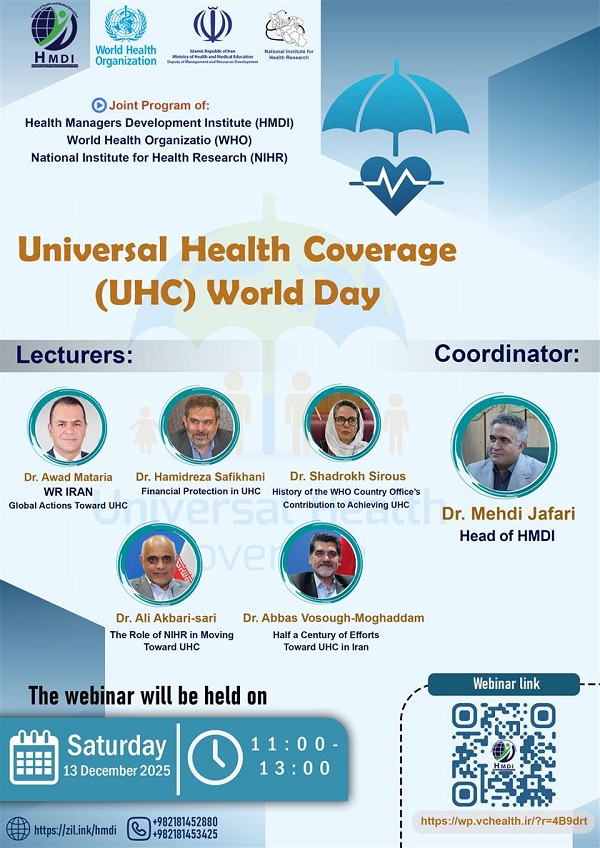 به اطلاع می رساند، موسسه عالی تربیت و توسعه مدیران نظام سلامت، در نظر دارد به مناسبت روز جهانی پوشش همگانی سلامت (UHC Day) رویداد وبیناری با هدف مرور آخرین تحولات فرصت ها، چالش ها و دستاوردهای مرتبط با پوشش همگانی سلامت، در نظام سلامت ایران را برگزار نماید.