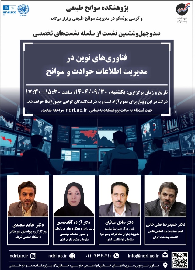 نشست فن آوری نوین در مدیریت اطلاعات حوادث وسوانح ۳۰ آذر ۱۴۰۴ | ۱۲:۰۴ کد : ۵۷۱۴۹ اطلاعیه ارسال به دیگران نام شما ایمیل شما ایمیل دریافتکننده ارسال انصراف تعداد بازدید:۶۹ دعوتنامه نشست فن آوری نوین در مدیریت اطلاعات حوادث وسوانح